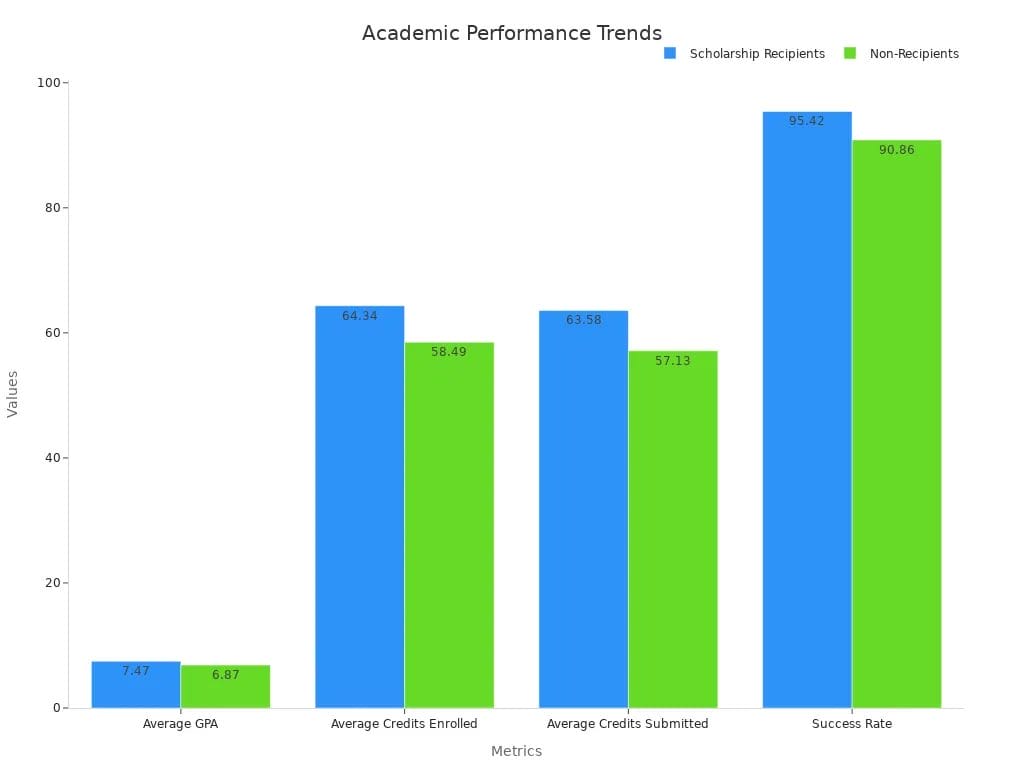 For instance, data shows scholarship students have a GPA of 7.47. Non-scholarship students average a GPA of 6.87. Scholarship students also take and finish more credits, with a success rate of 95.42%. This proves scholarships help students succeed in school.